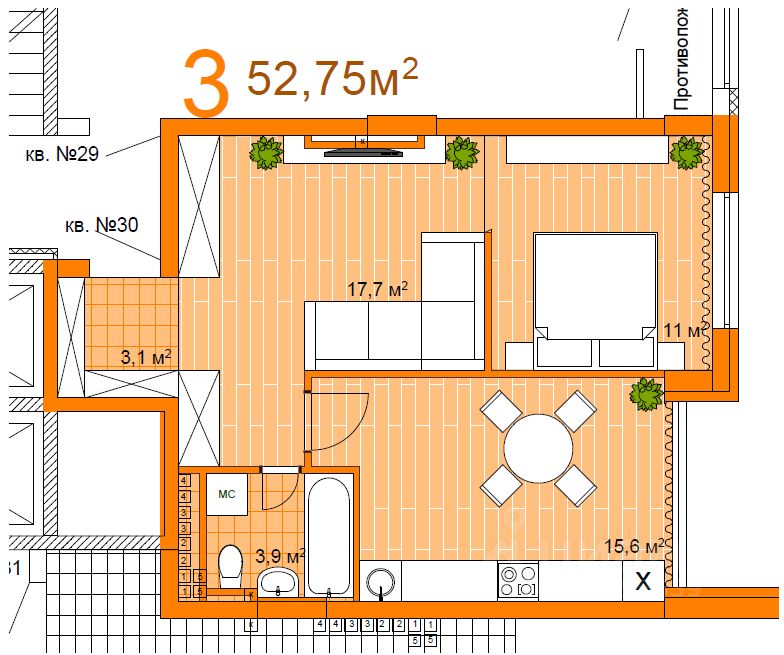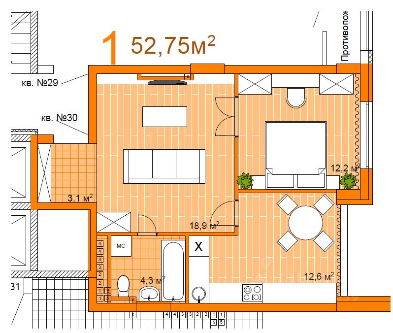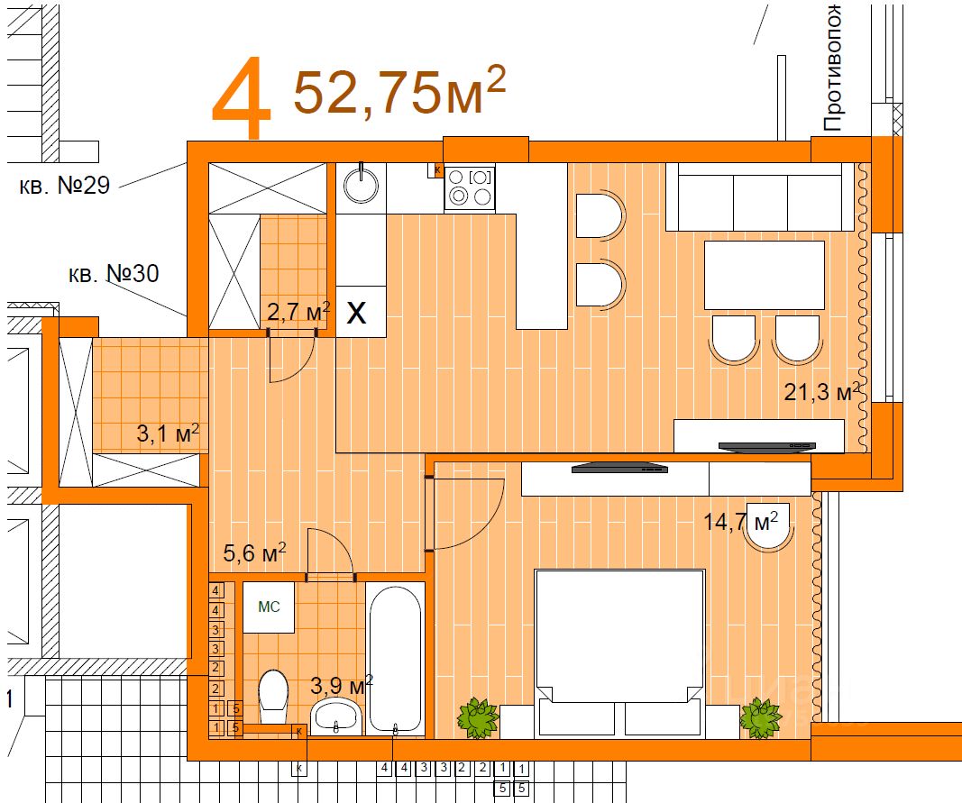 - общая площадь 52,7 м²,