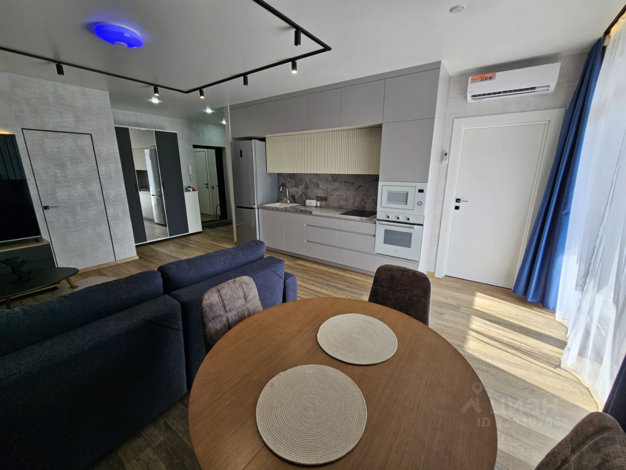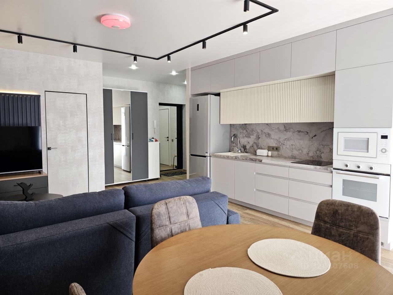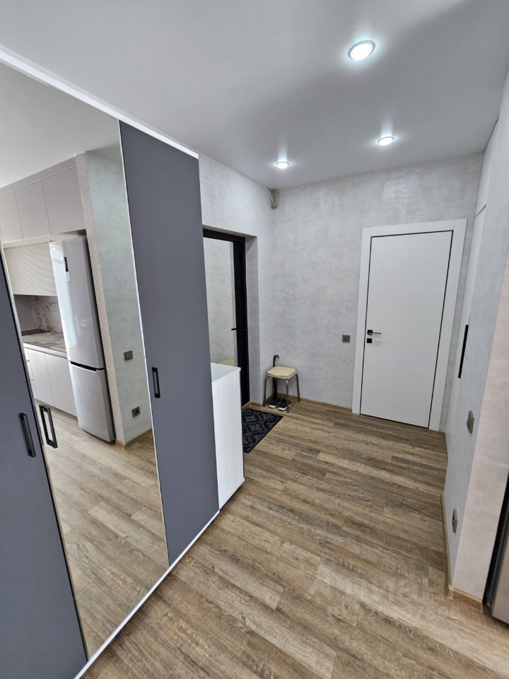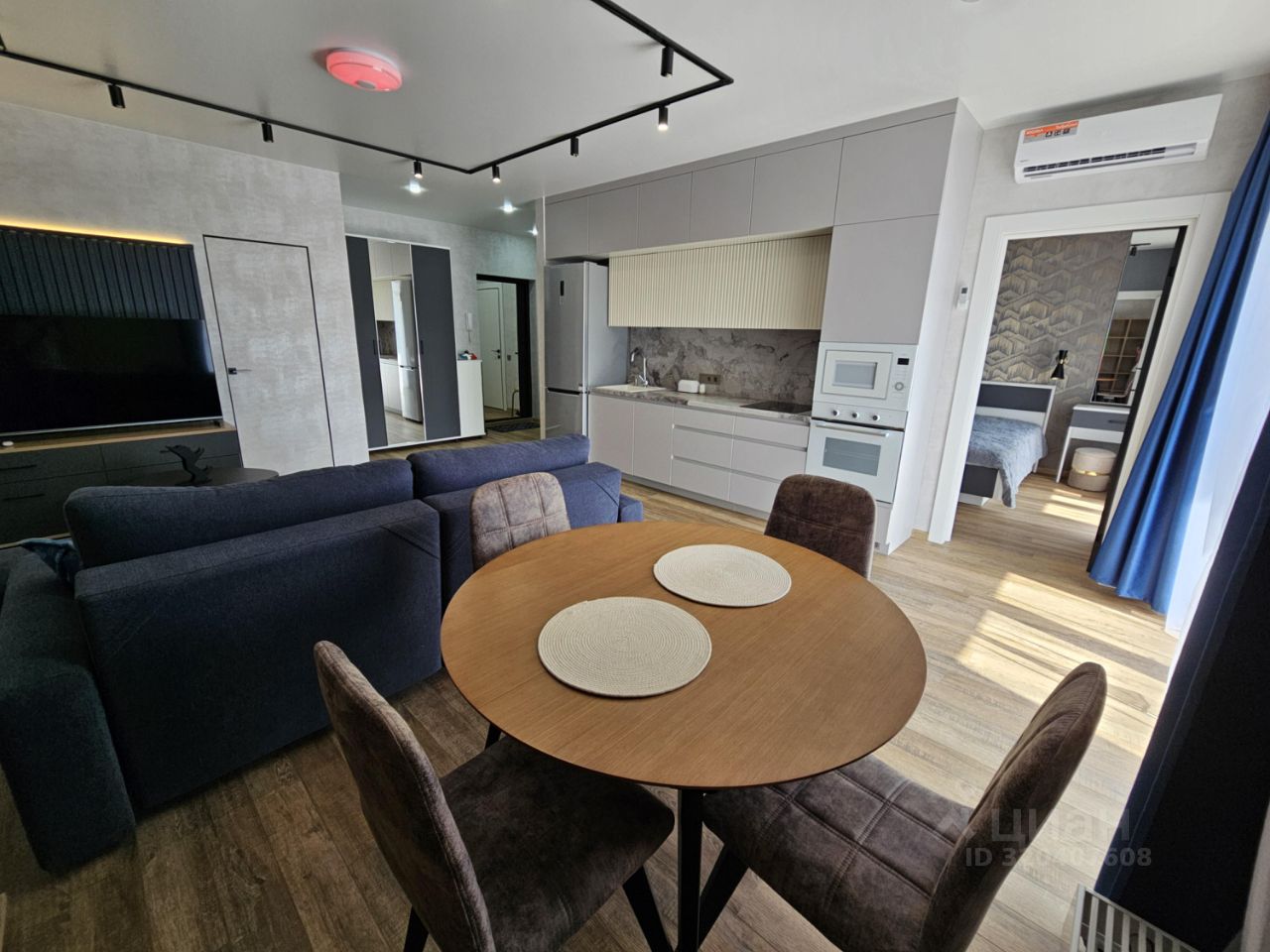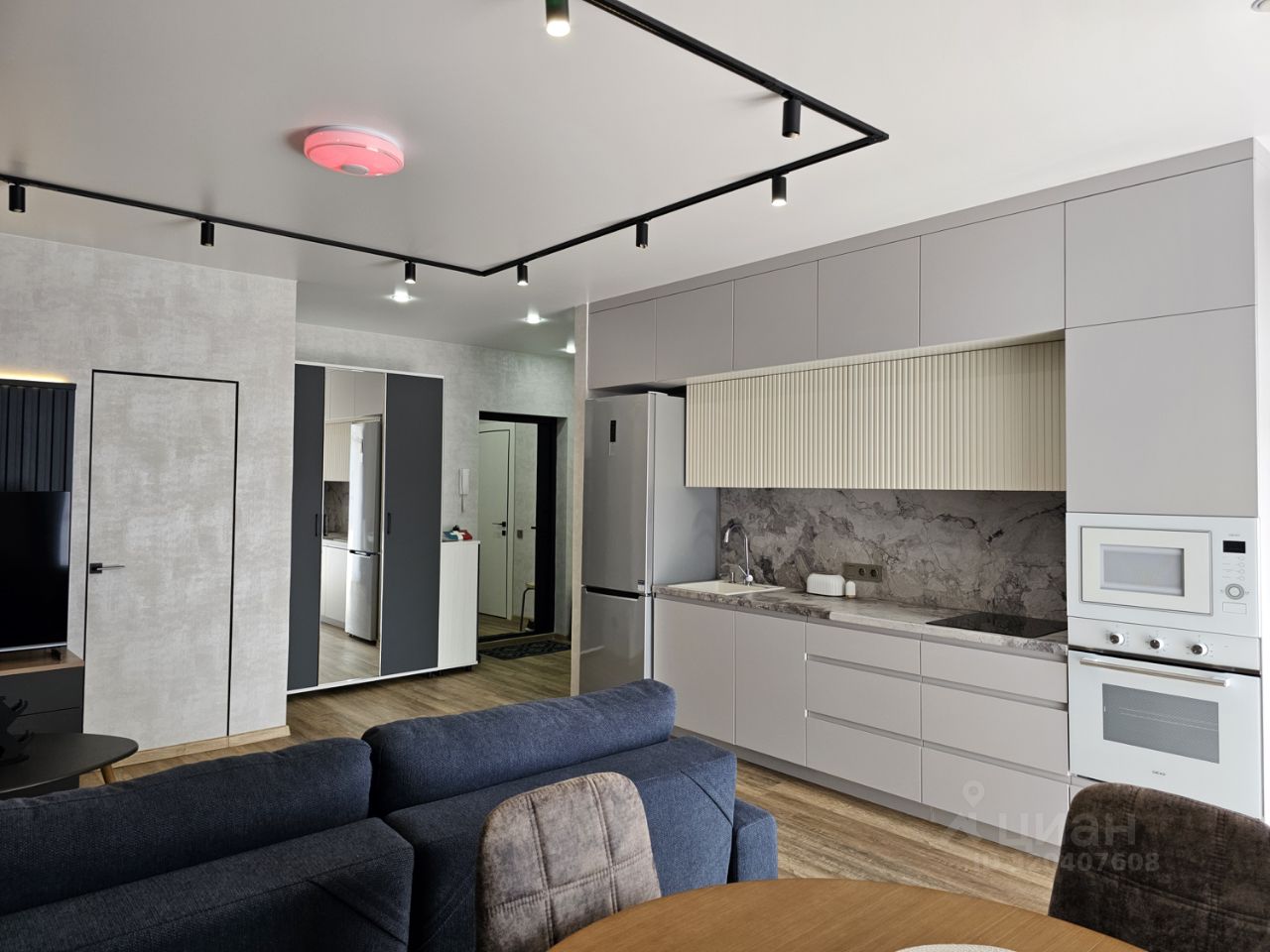 Квартира имеет отдельную спальню комнату с выходом на застекленную панорамную лоджию и кухню-гостиную, есть также отдельная гардеробная комната и совмещенный санузел. В кухне-гостиной установлен большой жк Смарт-ТВ, в спальне тоже есть телевизор. Также для комфортного проживания установлены кондиционер и посудомоечная машина.