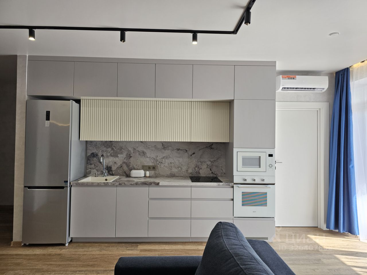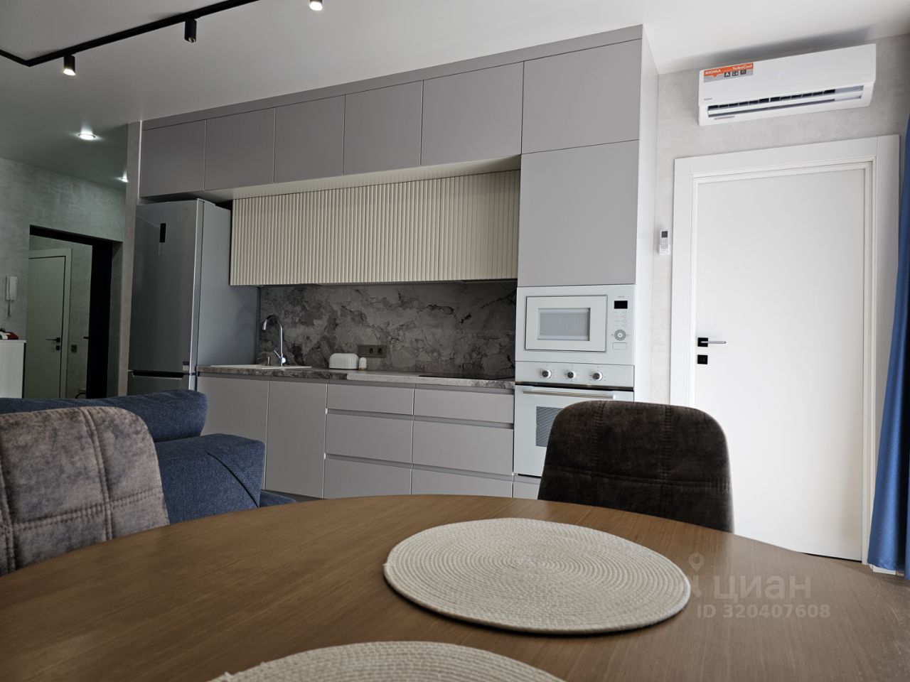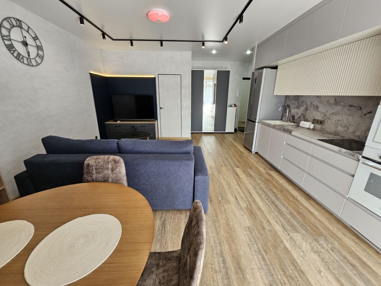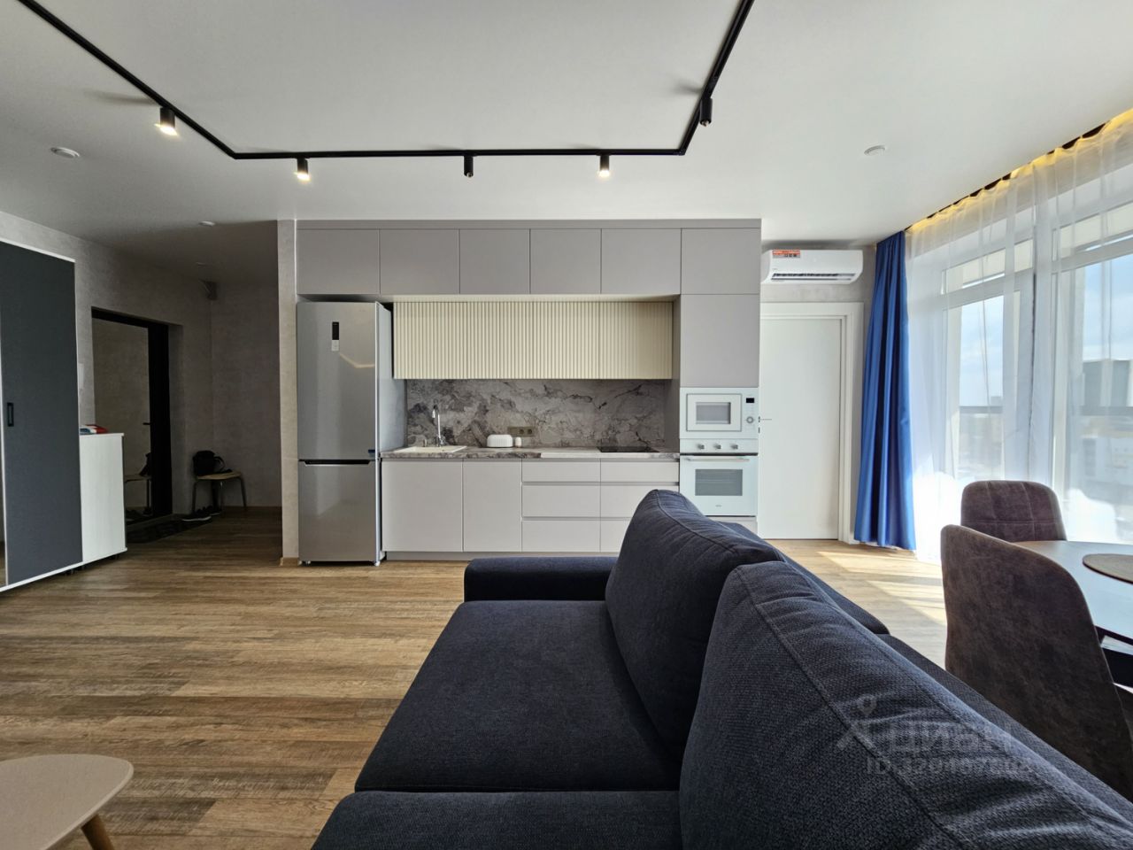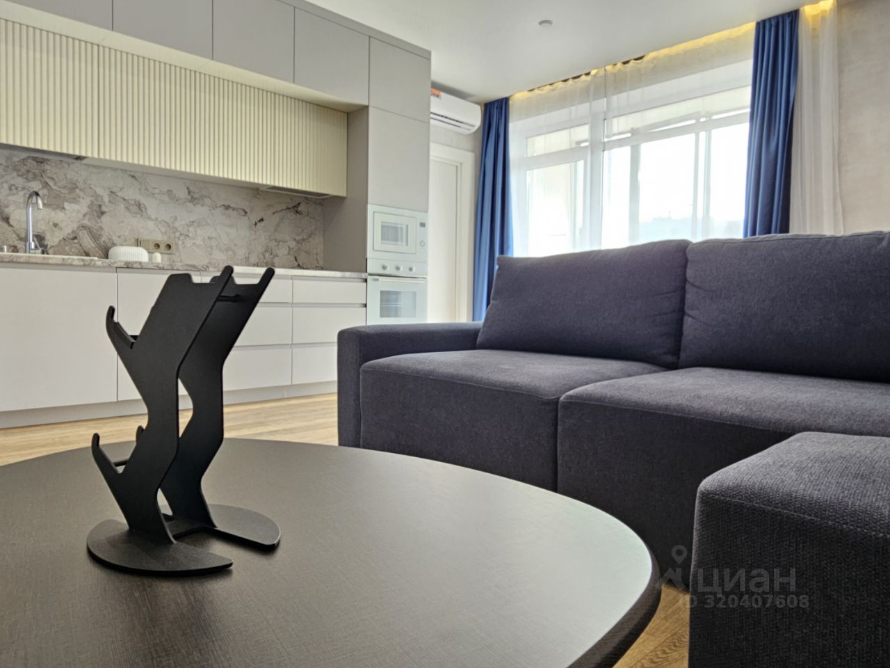 Квартира имеет отдельную спальню комнату с выходом на застекленную панорамную лоджию и кухню-гостиную, есть также отдельная гардеробная комната и совмещенный санузел. В кухне-гостиной установлен большой жк Смарт-ТВ, в спальне тоже есть телевизор. Также для комфортного проживания установлены кондиционер и посудомоечная машина.
