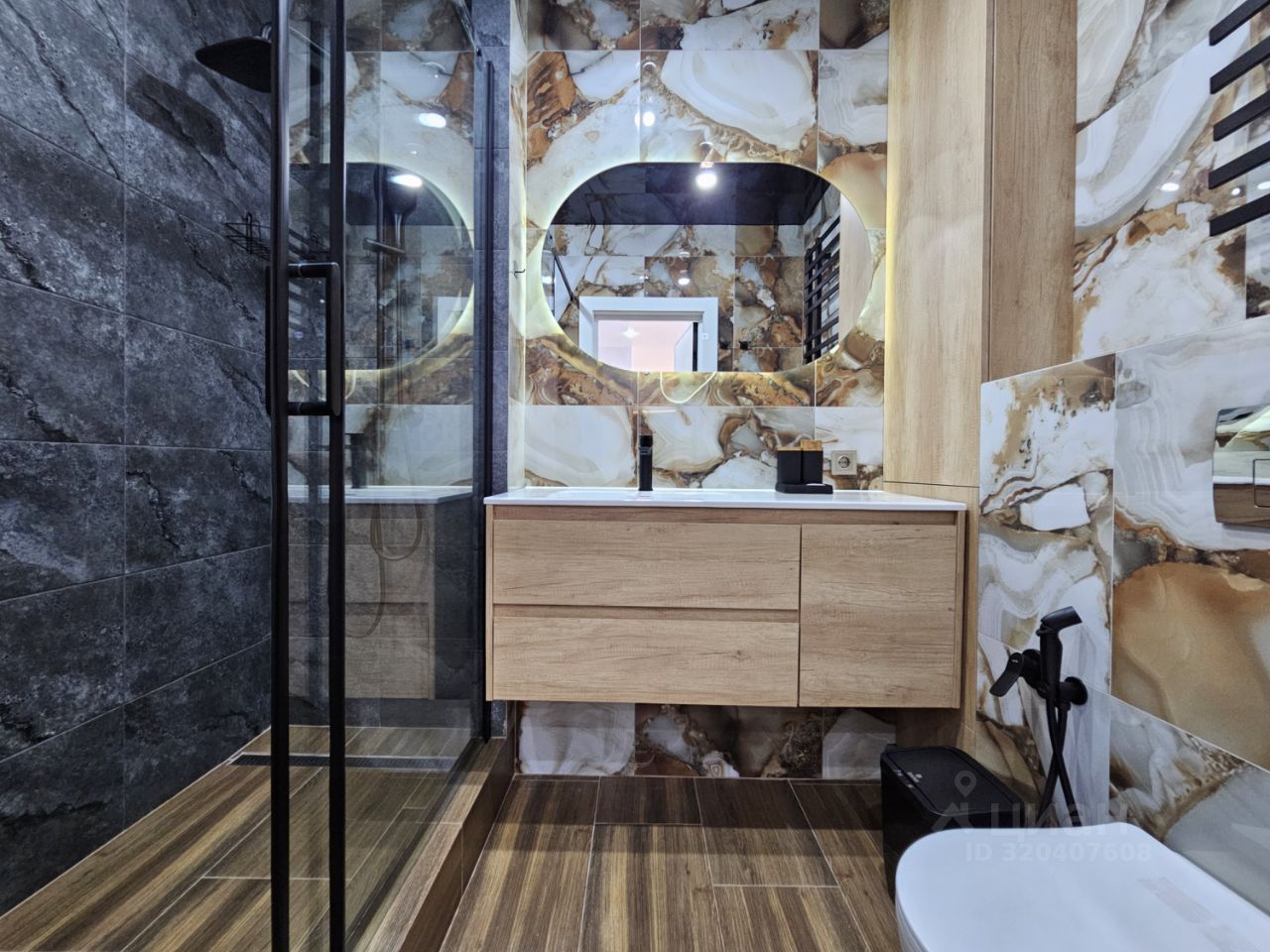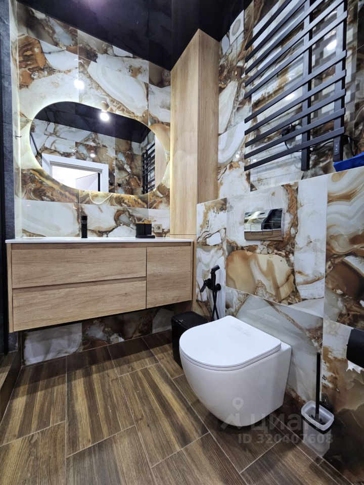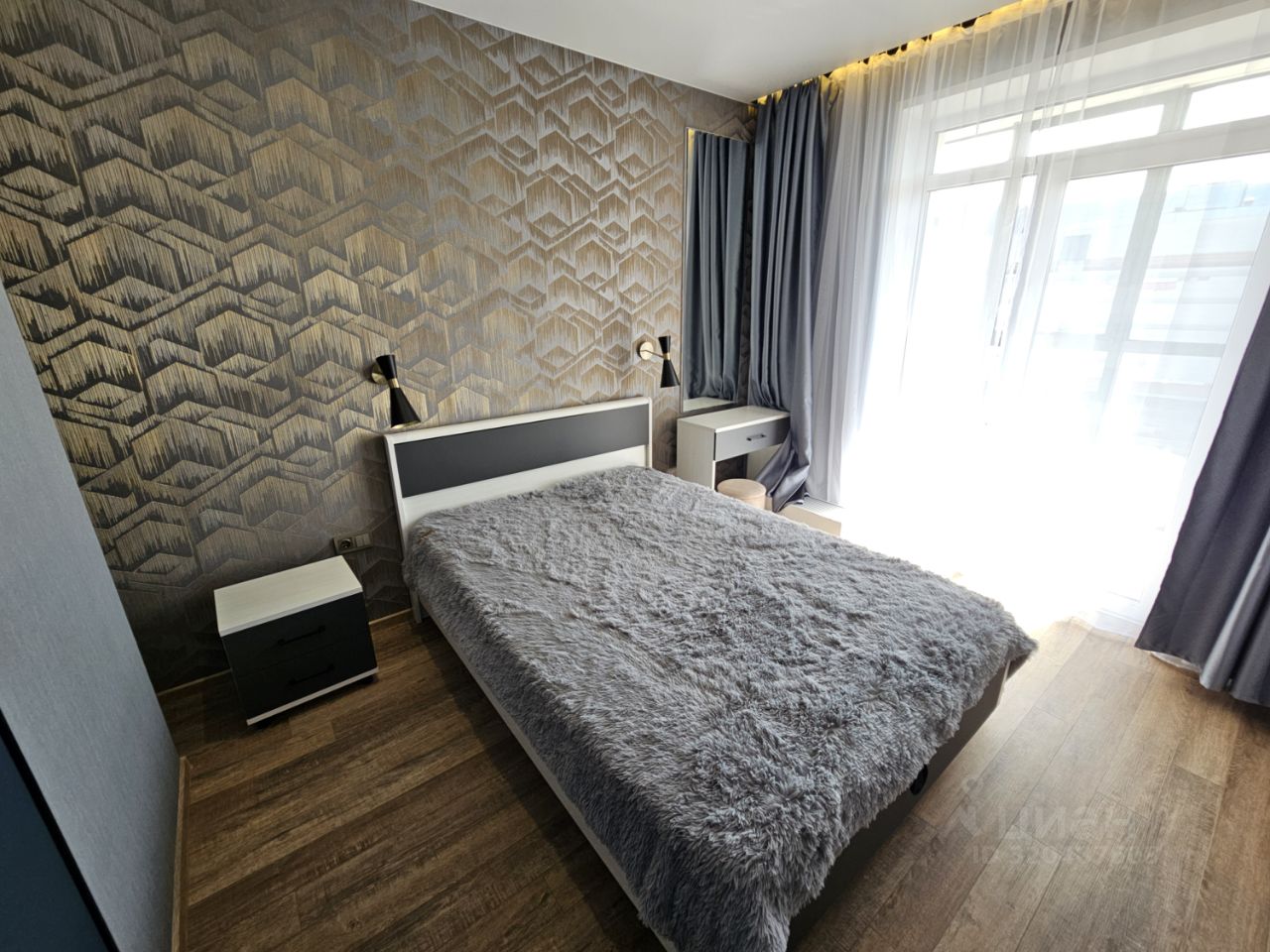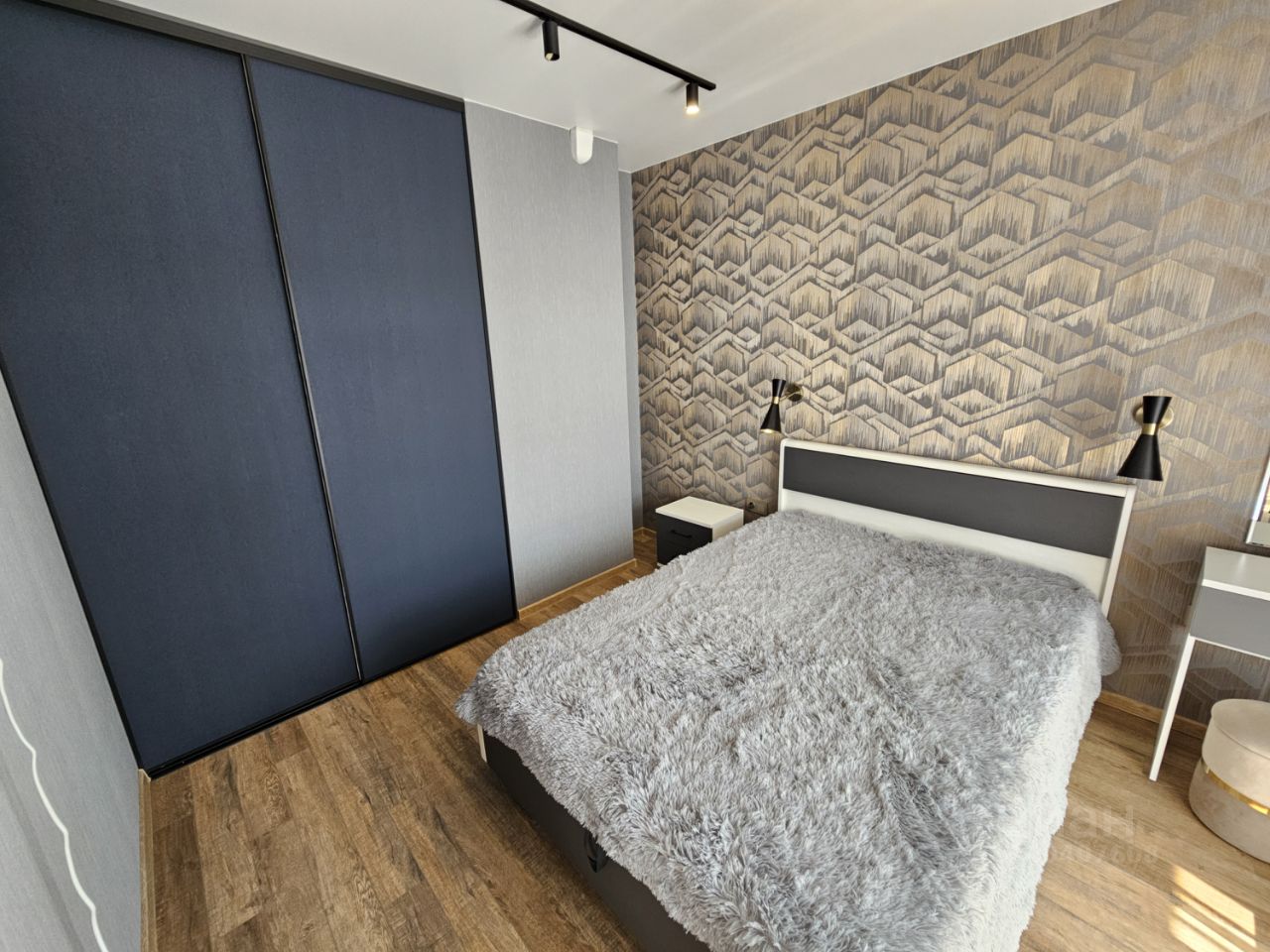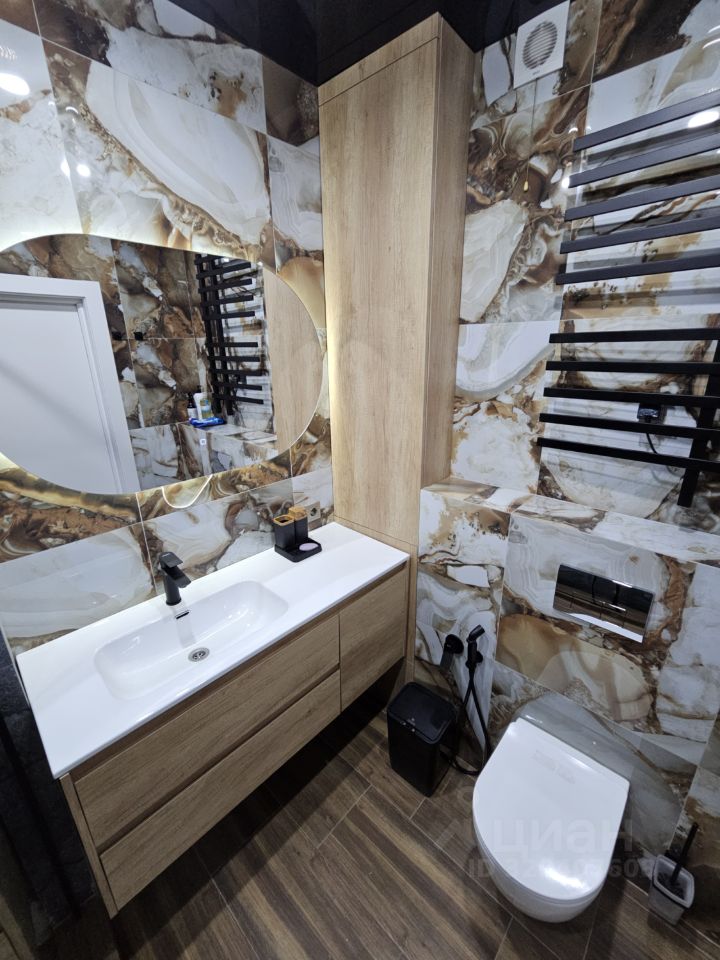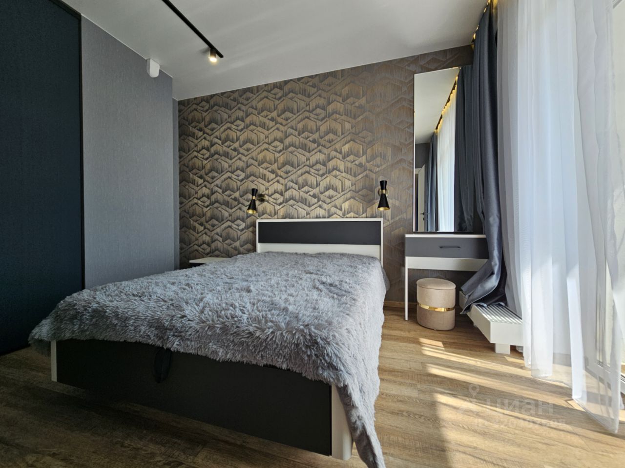 Квартира имеет отдельную спальню комнату с выходом на застекленную панорамную лоджию и кухню-гостиную, есть также отдельная гардеробная комната и совмещенный санузел. В кухне-гостиной установлен большой жк Смарт-ТВ, в спальне тоже есть телевизор. Также для комфортного проживания установлены кондиционер и посудомоечная машина.