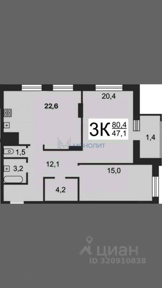 Продаётся 3-х комнатная квартира в ЖК Маленькая страна, площадью 80.4 м² на 5 этаже. Улица 40 лет Октября, дом 15 к3