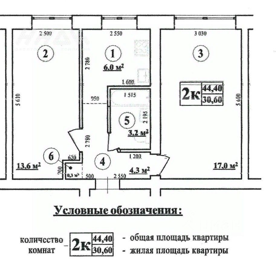 О квартире : * Общая площадь квартиры 44,4 кв. м., жилая площадь 30,6 кв.м.: 2 изолированные комнаты 17,0 кв.м. и 13,6 кв.м., функциональная кухня 6 кв.м., совмещённый санузел 3,2 кв.м., прихожая 4,3 кв.м., кладовая 0,3 кв.м. Этаж 1 из 5.