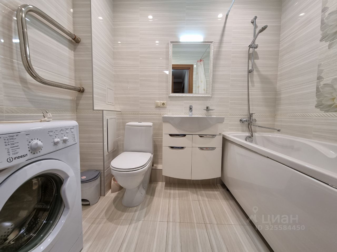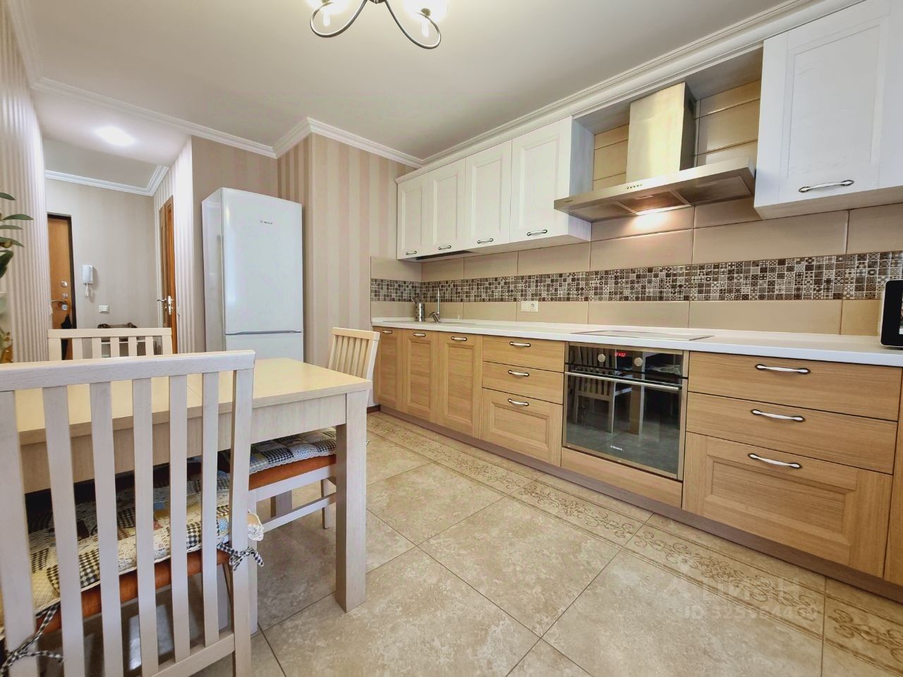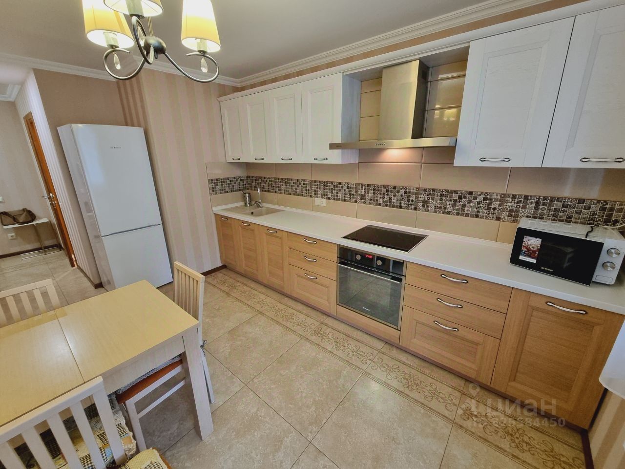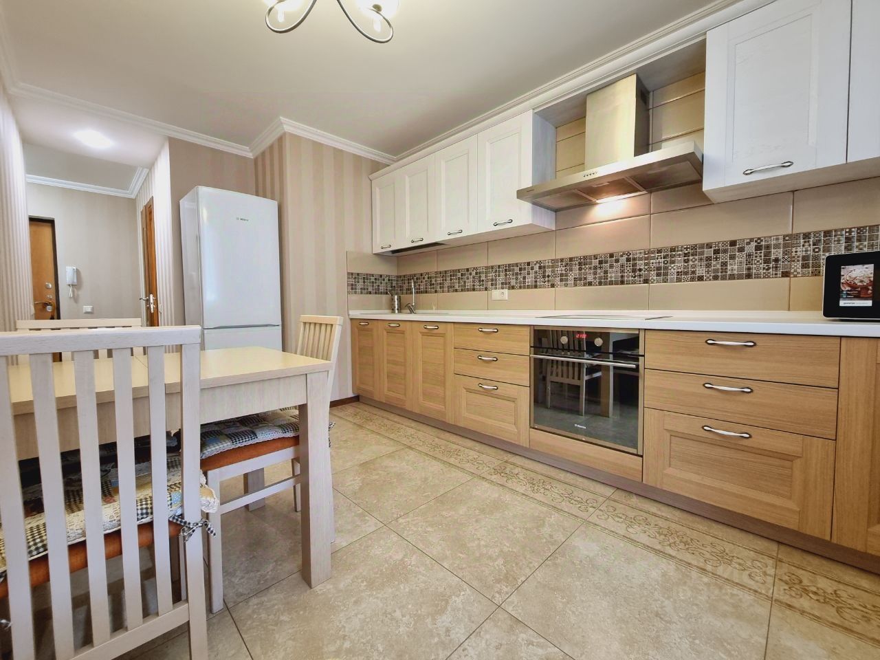 Есть гардеробная комната в прихожей. Кухня светлая и функциональная, оснащена всей необходимой техникой, включая холодильник и микроволновку. Ванная комната совмещенная, с современной сантехникой и стиральной машиной.